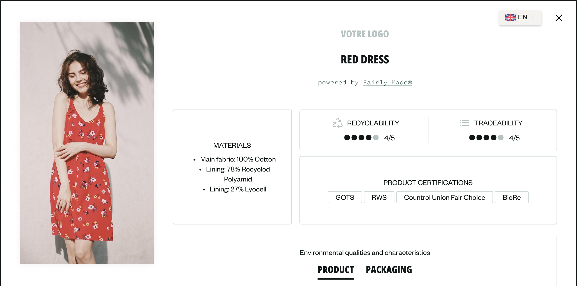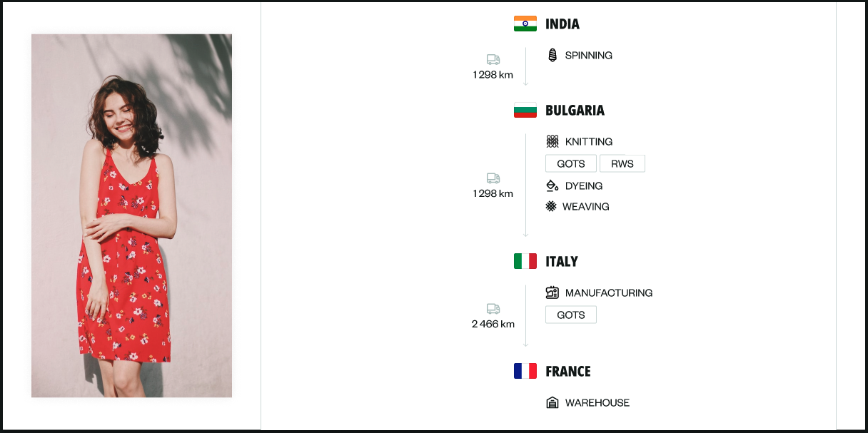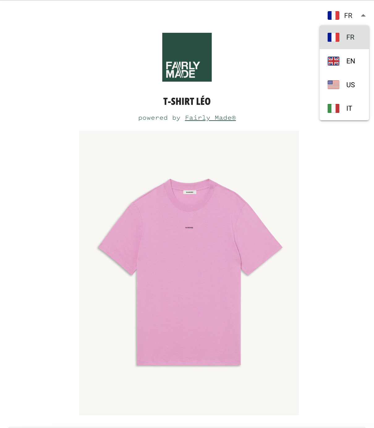 These product sheets are the same for all of products of the brand and are automatically generated. Once the customisation and layout are validated, the traceability information and product impact measurements are automatically plugged in.