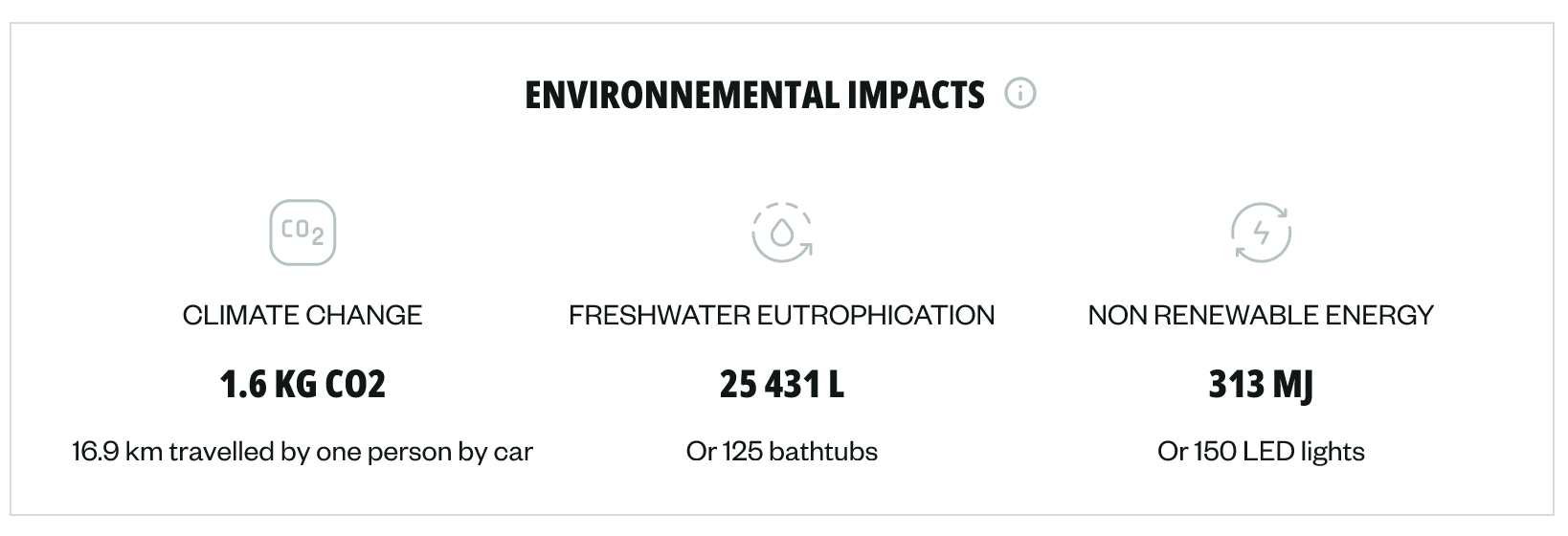 - For the equivalents of environmental impacts: the brand can decide whether to keep them or remove them from the product sheet and can choose the equivalences from the ADEME list (only say this if the brand requests it).